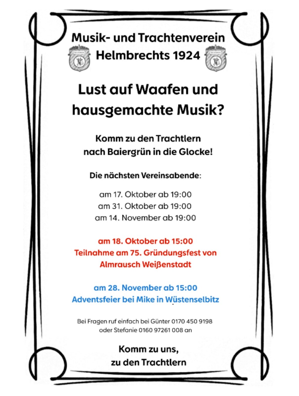 In 2024 feiern wir 100 Jahre Musik- und Trachtenverein Helmbrechts. Für unsere Planung nehmen wir bereits jetzt Reservierungen für euch vor. Meldet euch einfach bei Stefanie (016097261008) oder Günter (01704509198)